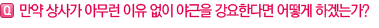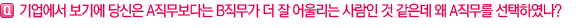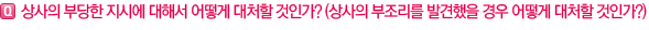 | 이 질문 역시 ‘부당한 지시’에 대한 판단의 기준이 나와있지 않기 때문에 신입사원이 답하기에는 어렵게 느껴질 수 있습니다. 또한 자신이 제대로 이해한 것인지 ‘자기반성’의 과정도 매우 중요합니다. 이러한 과정을 거치면서 신중함을 확보할 수 있어야 합니다. 이것이 단순한 의견 마찰 일수도 있고, 규칙에 어긋나지만 융통성 범위 내에서 가능한 일일 수도 있기 때문입니다. 만약 이러한 범주에 속하지 않는 일이라면, 회사에 해악을 끼치는 일이 될 수도 있습니다. 따라서 부당하다는 생각이 들면 해당 상사와 상의를 해서 직접 해결하는 것이 가장 중요한데 직책간 거리감이 있다라고 판단이 되면 가장 가까운 선배와 상의를 하는 것도 하나의 방법이 될 수 있습니다. |