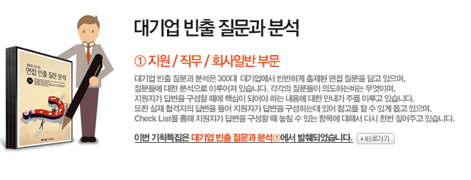 이번 기획특집은 국내 300대 대기업에서 출제된 모든 면접질문을 담고 있으며 그 질문에 대한 분석으로 이루어져 있습니다. 총 3권의 가이드 중에서 지원, 직무 그리고 회사 일반에 관한 질문내용을 다루고 있는 첫번째 기획특집입니다. |