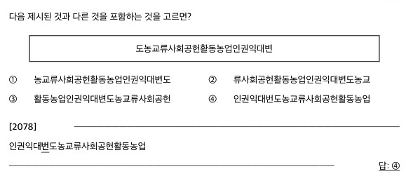 아래 문제는 실제 출제된다고 알려져 있는 유형의 문제를 제가 조금 변형해서 난도를 높여 놓은 것입니다. 실제 오리지널 문제는 글자들의 순서들의 바뀜이 없이 똑같은 선택지문 네 개중 세 개가 문제의 보기와 똑같습니다. 하나만 한 글자 살짝 다른거죠. 아마 농협 참고서 갖고 계신 분은 그런 문제 발견할 수 있을겁니다.
