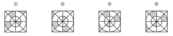 1. 첫번째 문제와 같은 복잡한 문양의 문제는 모서리의 모양을 먼저 비교합니다. 검은색으로 크게 칠해진 부분을 보면 ②, ③번이 서로 180도 회전한 도형임을 알 수 있습니다. 그 두 개를 비교하면 알파벳 Y가 두 그림에서 같으니 하나는 틀렸다는 것이 보입니다.